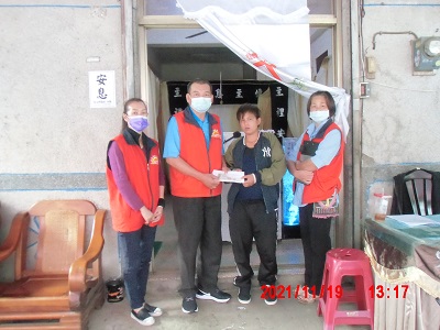 發放組:陳桂玉 鍾育素等前往探視慰問並捐贈棺木補助費用。